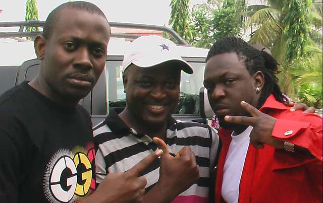 Moments before a concert DJ Dollie is flanked by J. Martins (left) and Timaya two of Nigeria's hottest solo acts.